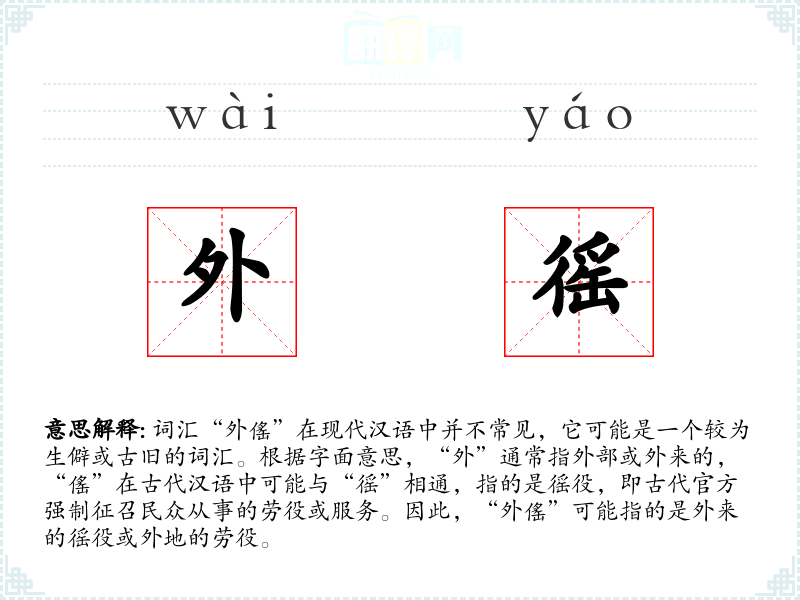 词汇“外傜”在现代汉语中并不常见,它可能是一个较为生僻或古旧的词汇。根据字面意思,“外”通常指外部或外来的,“傜”在古代汉语中可能与“徭”相通,指的是徭役,即古代官方强制征召民众从事的劳役或服务。因此,“外傜”可能指的是外来的徭役或外地的劳役。
