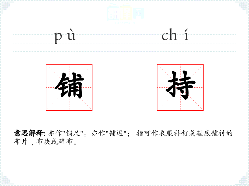 亦作"铺尺"。亦作"铺迟"; 指可作衣服补钉或鞋底铺衬的布片﹑布块或碎布。