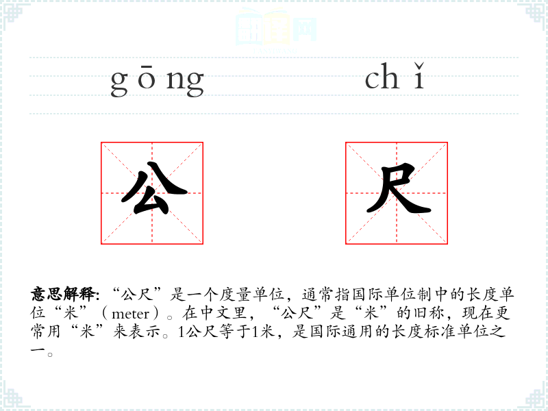 - 同义词:米、公尺、米尺(均指长度单位)