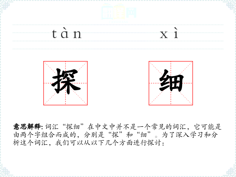 词汇“探细”在中文中并不是一个常见的词汇,它可能是由两个字组合而成的,分别是“探”和“细”。为了深入学习和分析这个词汇,我们可以从以下几个方面进行探讨: