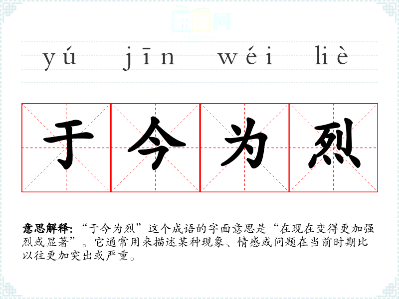- 文学:在文学作品中,这个成语可以用来强调某个主题或冲突的紧迫性和严重性。例如,在描述社会问题的小说中,作者可能会用“于今为烈”来表达问题的加剧。