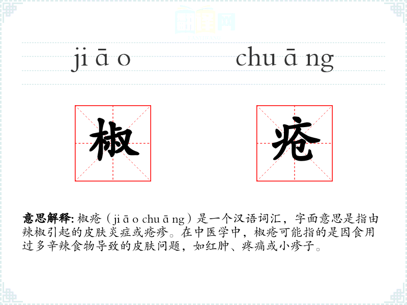 - 反义词:清凉、舒适(这些词汇与椒疮带来的不适感形成对比)