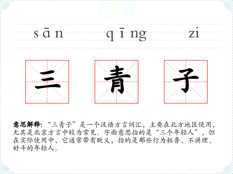 “三青子”是一个汉语方言词汇,主要在北方地区使用,尤其是北京方言中较为常见。字面意思指的是“三个年轻人”,但在实际使用中,它通常带有贬义,指的是那些行为粗鲁、不讲理、好斗的年轻人。