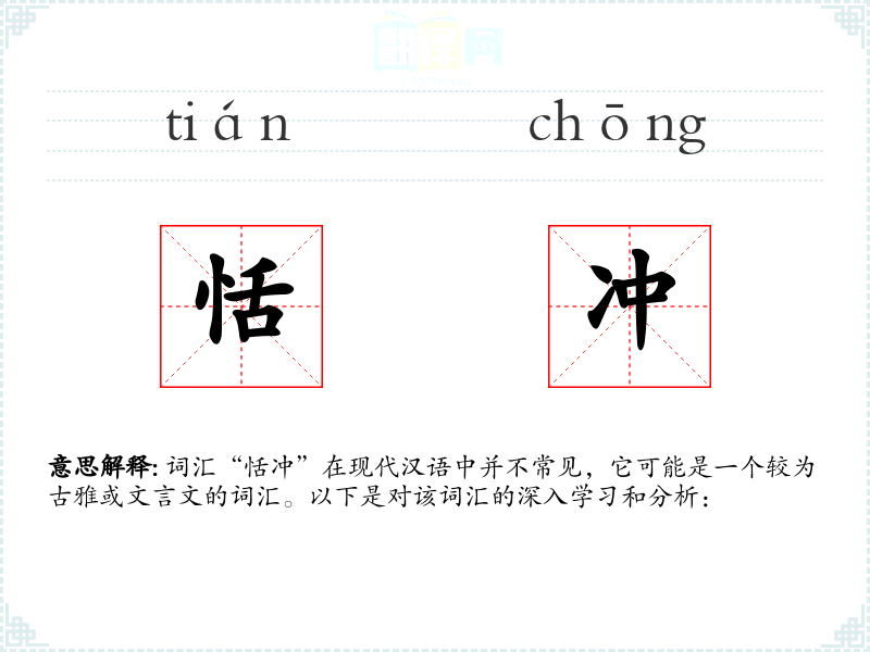 词汇“恬冲”在现代汉语中并不常见,它可能是一个较为古雅或文言文的词汇。以下是对该词汇的深入学*和分析: