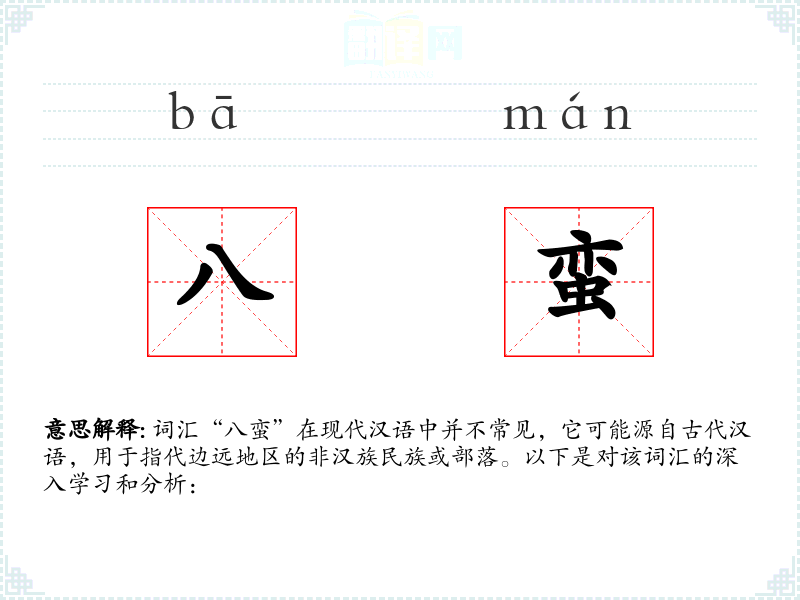 词汇“八蛮”在现代汉语中并不常见,它可能源自古代汉语,用于指代边远地区的非*民族或部落。以下是对该词汇的深入学和分析: