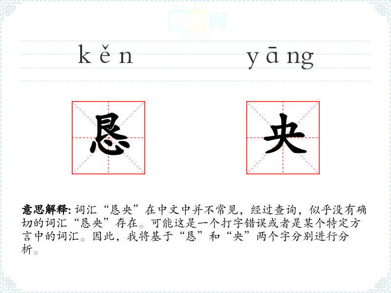 词汇“恳央”在中文中并不常见,经过查询,似乎没有确切的词汇“恳央”存在。可能这是一个打字错误或者是某个特定方言中的词汇。因此,我将基于“恳”和“央”两个字分别进行分析。