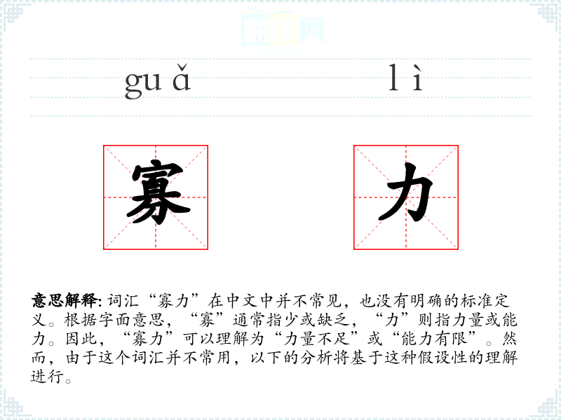 词汇“寡力”在中文中并不常见,也没有明确的标准定义。根据字面意思,“寡”通常指少或缺乏,“力”则指力量或能力。因此,“寡力”可以理解为“力量不足”或“能力有限”。然而,由于这个词汇并不常用,以下的分析将基于这种假设性的理解进行。