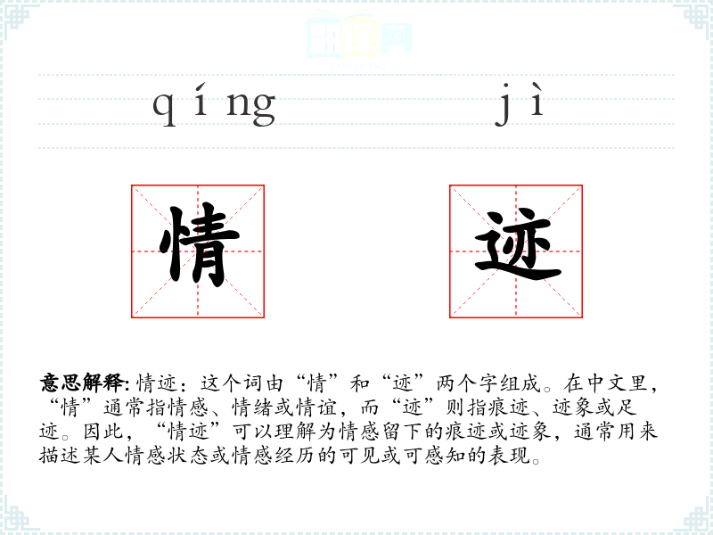 情迹:这个词由“情”和“迹”两个字组成。在中文里,“情”通常指情感、情绪或情谊,而“迹”则指痕迹、迹象或足迹。因此,“情迹”可以理解为情感留下的痕迹或迹象,通常用来描述某人情感状态或情感经历的可见或可感知的表现。