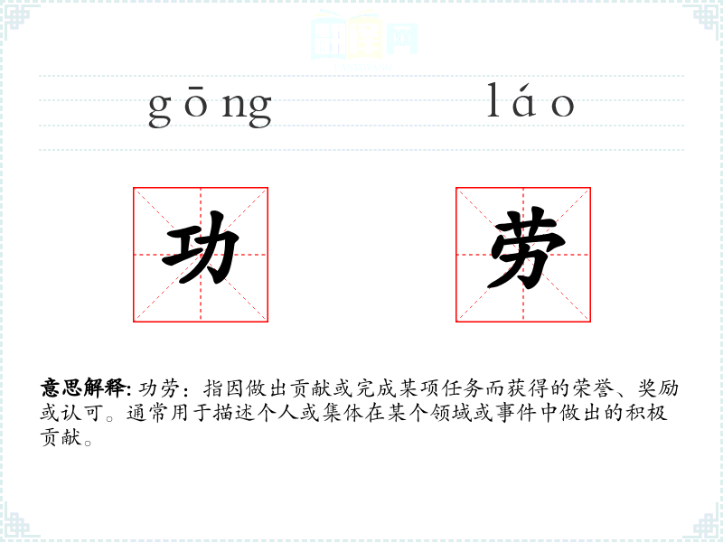 功劳:指因做出贡献或完成某项任务而获得的荣誉、奖励或认可。通常用于描述个人或集体在某个领域或**中做出的积极贡献。