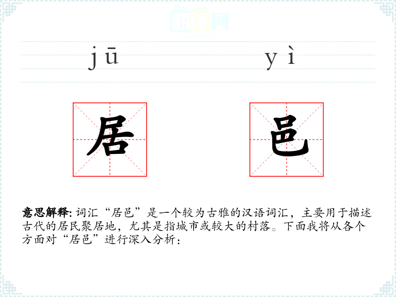 - 专业领域:在历史学、考古学等领域,“居邑”用于描述古代的居民点和城市遗址,是研究古代社会结构和城市发展的重要词汇。