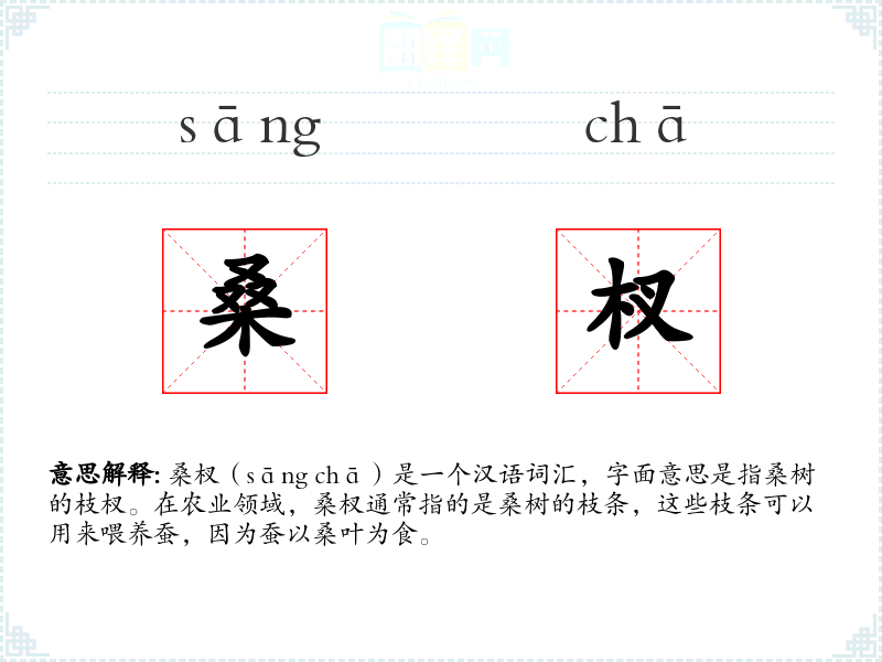 桑杈(sāng chā)是一个汉语词汇,字面意思是指桑树的枝杈。在农业领域,桑杈通常指的是桑树的枝条,这些枝条可以用来喂养蚕,因为蚕以桑叶为食。