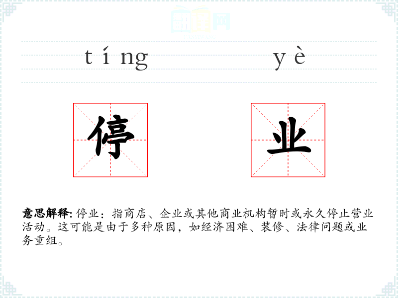 “停业”一词由“停”和“业”组成,其中“停”意味着停止,“业”指业务或工作。这个词在中文中历史悠久,随着商业活动的发展,其含义和使用场景也逐渐丰富。