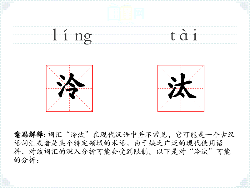 词汇“泠汰”在现代汉语中并不常见,它可能是一个古汉语词汇或者是某个特定领域的术语。由于缺乏广泛的现代使用语料,对该词汇的深入分析可能会受到限制。以下是对“泠汰”可能的分析: