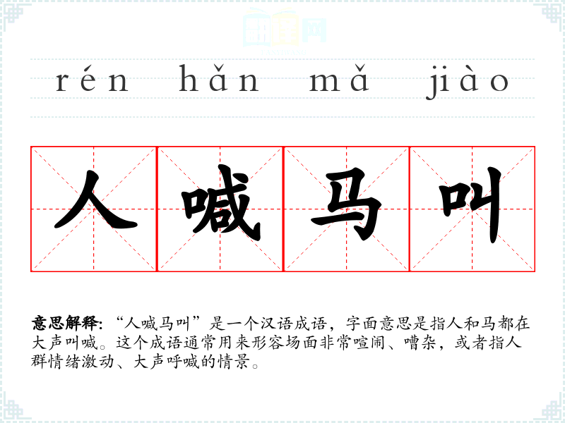 “人喊马叫”是一个汉语成语,字面意思是指人和马都在大声叫喊。这个成语通常用来形容场面非常喧闹、嘈杂,或者指人群情绪激动、大声呼喊的情景。