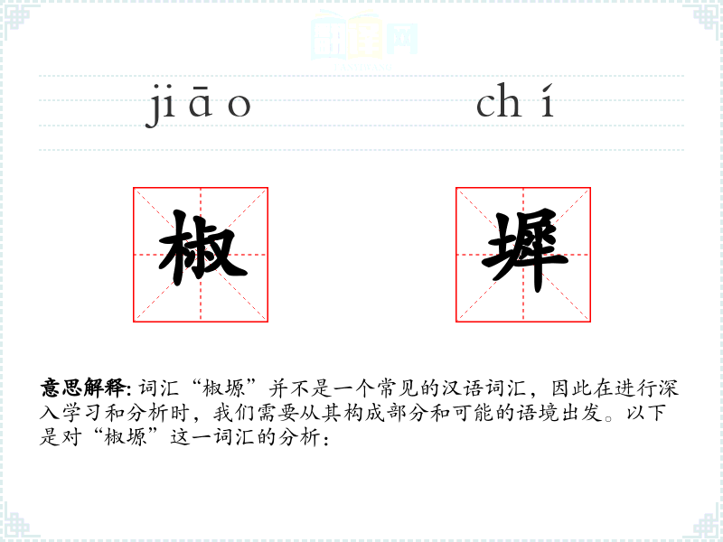 词汇“椒塬”并不是一个常见的汉语词汇,因此在进行深入学*和分析时,我们需要从其构成部分和可能的语境出发。以下是对“椒塬”这一词汇的分析: