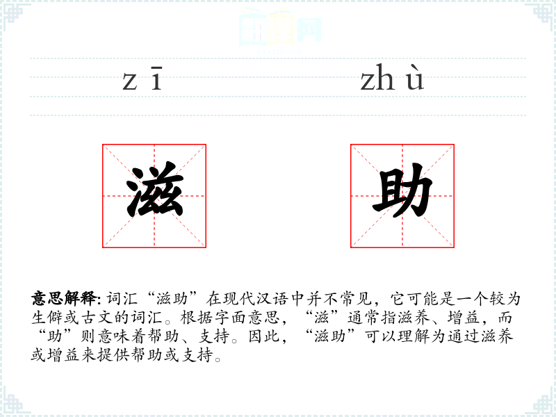 - 文学:在古文或诗词中,可能用来形容自然界或人际关系中的滋养和支持,如“春雨滋助万物生长”。
