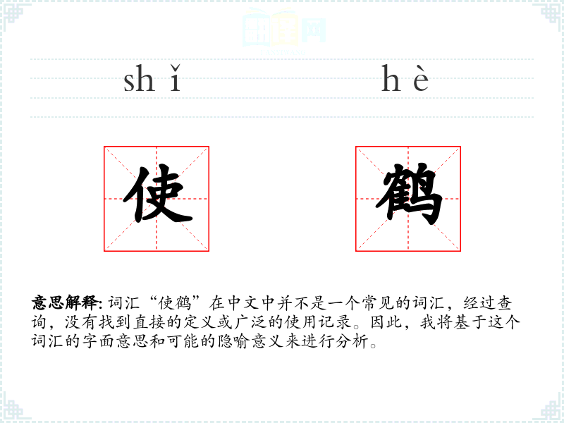 词汇“使鹤”在中文中并不是一个常见的词汇,经过查询,没有找到直接的定义或广泛的使用记录。因此,我将基于这个词汇的字面意思和可能的隐喻意义来进行分析。
