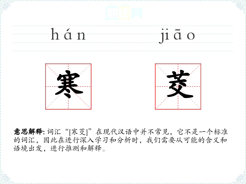 词汇“[寒茭]”在现代汉语中并不常见,它不是一个标准的词汇,因此在进行深入学*和分析时,我们需要从可能的含义和语境出发,进行推测和解释。