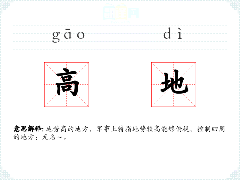 地势高的地方,军事上特指地势较高能够俯视、控制四周的地方:无名~。