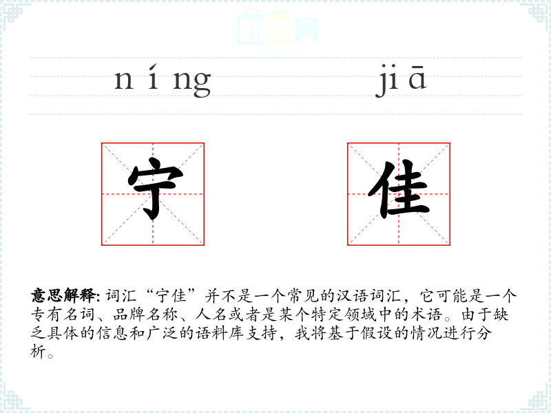 词汇“宁佳”并不是一个常见的汉语词汇,它可能是一个专有名词、品牌名称、人名或者是某个特定领域中的术语。由于缺乏具体的信息和广泛的语料库支持,我将基于假设的情况进行分析。