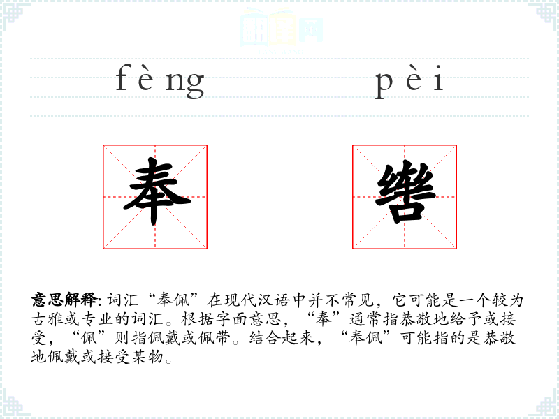 - 词源:“奉”和“佩”都是古代汉语中的常用字,组合起来形成了一个表达特定礼仪行为的词汇。