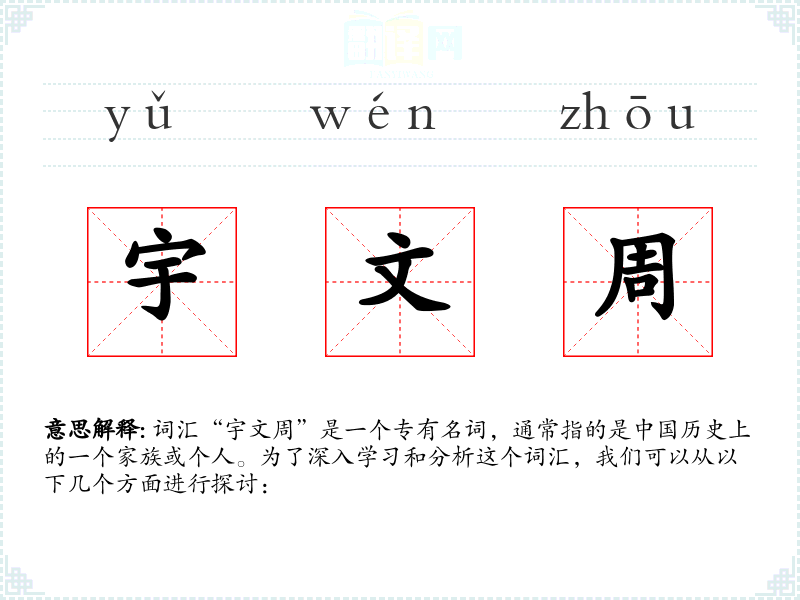 “宇文”是姓氏,源自鲜卑语,而“周”指的是北周这个朝代。这个词汇随着历史的发展而形成,主要用于指代特定的历史时期和家族。