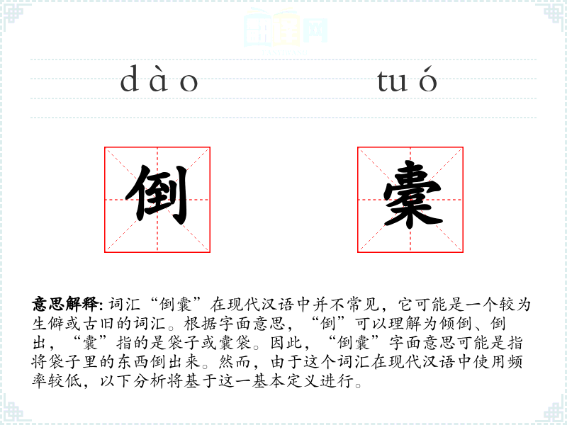 词汇“倒囊”在现代汉语中并不常见,它可能是一个较为生僻或古旧的词汇。根据字面意思,“倒”可以理解为倾倒、倒出,“囊”指的是袋子或囊袋。因此,“倒囊”字面意思可能是指将袋子里的东西倒出来。然而,由于这个词汇在现代汉语中使用频率较低,以下分析将基于这一基本定义进行。