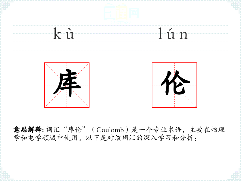 词汇“库伦”(Coulomb)是一个专业术语,主要在物理学和电学领域中使用。以下是对该词汇的深入学习和分析: