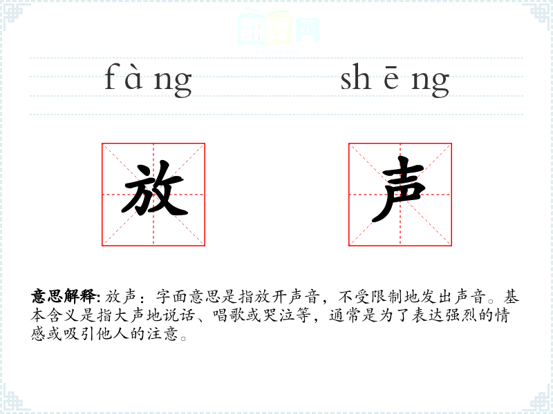 放声:字面意思是指放开声音,不受限制地发出声音。基本含义是指大声地说话、唱歌或哭泣等,通常是为了表达强烈的情感或吸引他人的注意。