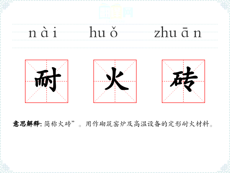 简称火砖”。用作砌筑窑炉及高温设备的定形耐火材料。