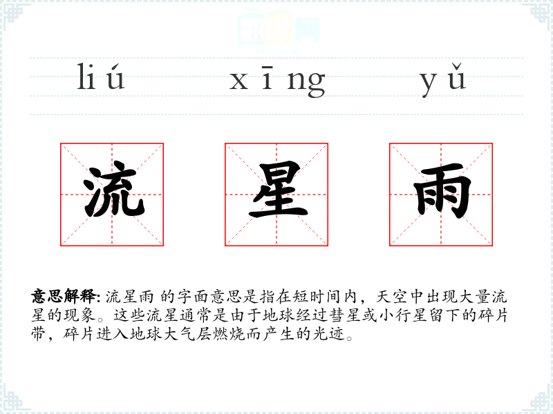 流星雨 的字面意思是指在短时间内,天空中出现大量流星的现象。这些流星通常是由于地球经过彗星或小行星留下的碎片带,碎片进入地球大气层燃烧而产生的光迹。