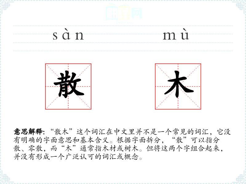 “散木”这个词汇在中文里并不是一个常见的词汇,它没有明确的字面意思和基本含义。根据字面拆分,“散”可以指分散、零散,而“木”通常指木材或树木。但将这两个字组合起来,并没有形成一个广泛认可的词汇或概念。