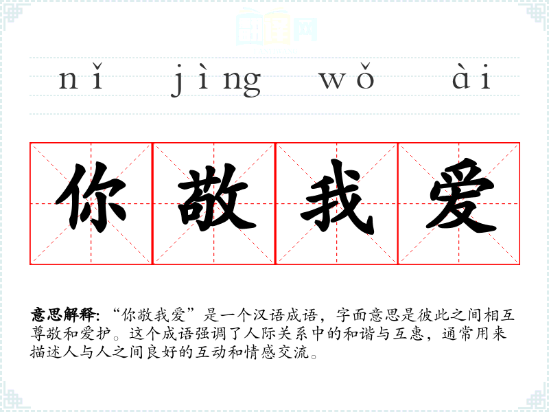 “你敬我爱”是一个汉语成语,字面意思是彼此之间相互尊敬和爱护。这个成语强调了人际关系中的和谐与互惠,通常用来描述人与人之间良好的互动和情感交流。
