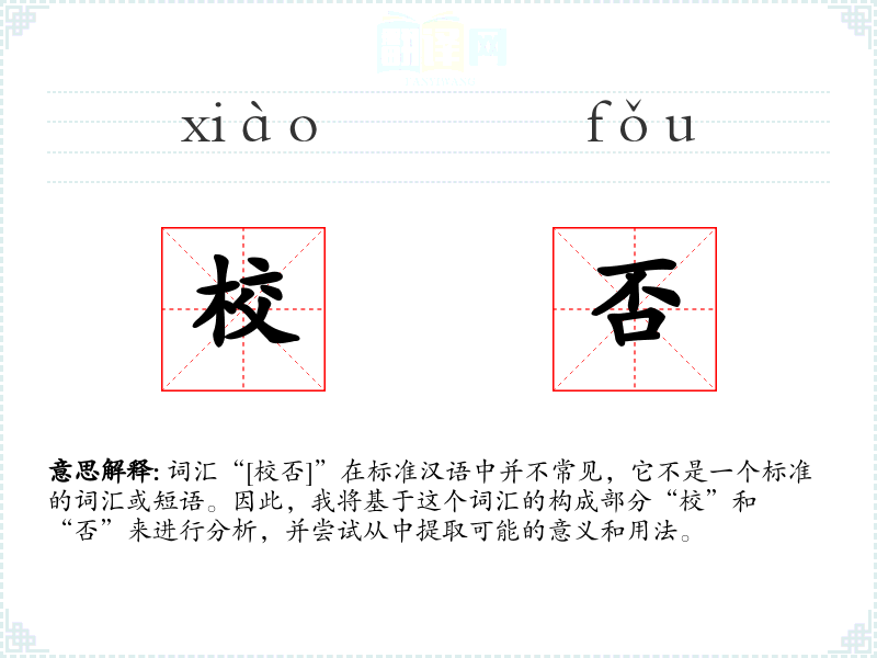 词汇“[校否]”在标准汉语中并不常见,它不是一个标准的词汇或短语。因此,我将基于这个词汇的构成部分“校”和“否”来进行分析,并尝试从中提取可能的意义和用法。