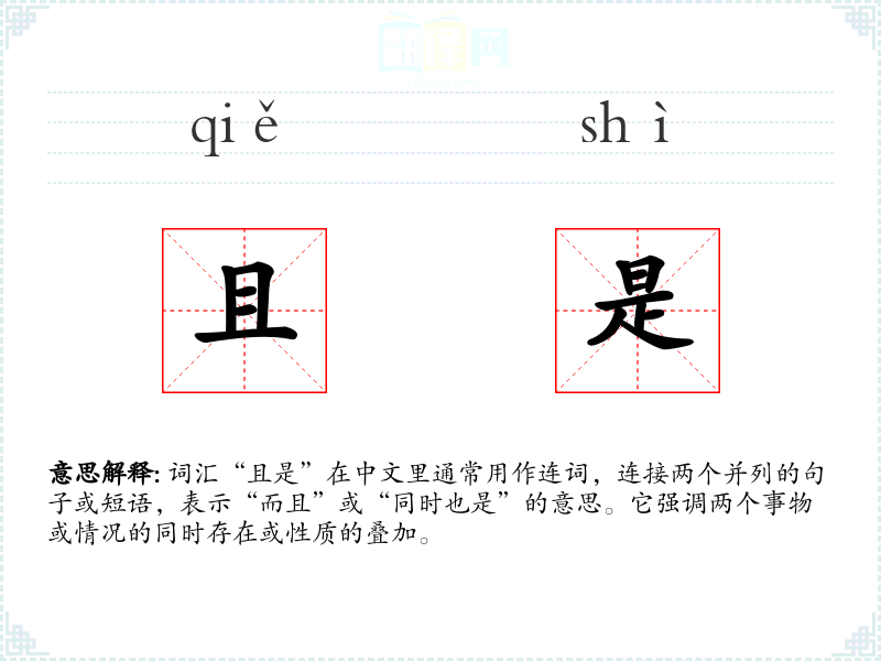 词汇“且是”在中文里通常用作连词,连接两个并列的句子或短语,表示“而且”或“同时也是”的意思。它强调两个事物或情况的同时存在或性质的叠加。