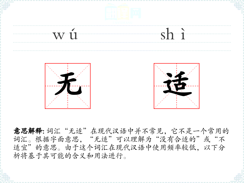 词汇“无适”在现代汉语中并不常见,它不是一个常用的词汇。根据字面意思,“无适”可以理解为“没有合适的”或“不适宜”的意思。由于这个词汇在现代汉语中使用频率较低,以下分析将基于其可能的含义和用法进行。