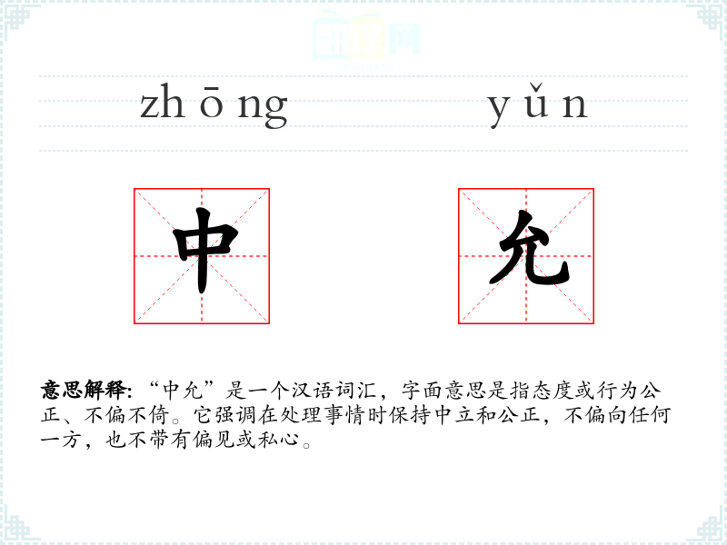 “中允”是一个汉语词汇,字面意思是指态度或行为公正、不偏不倚。它强调在处理事情时保持中立和公正,不偏向任何一方,也不带有偏见或私心。