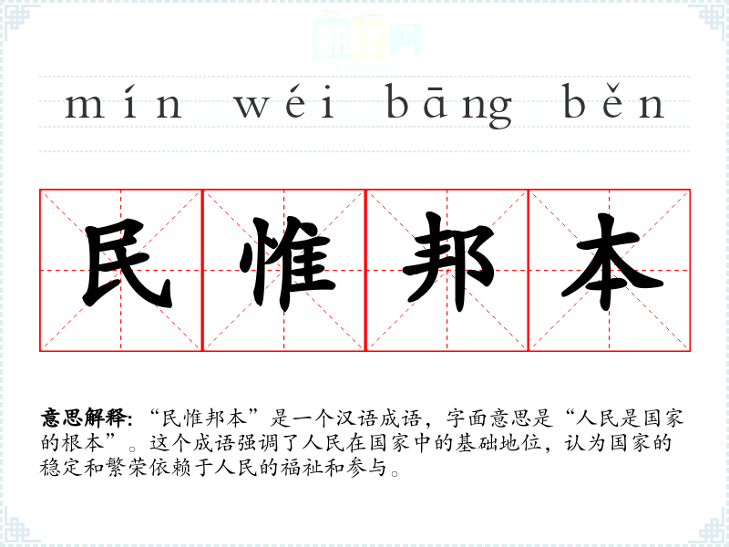 “民惟邦本”是一个汉语成语,字面意思是“人民是国家的根本”。这个成语强调了人民在国家中的基础地位,认为国家的稳定和繁荣依赖于人民的福祉和参与。