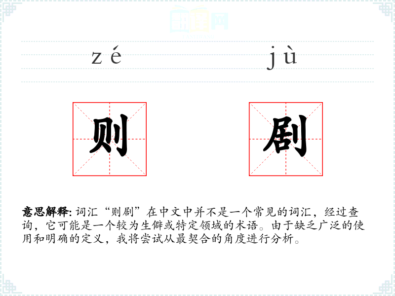 “则剧”这个词在现代汉语中并不常见,它可能是一个特定领域的术语,或者是某个方言中的词汇。在没有更多信息的情况下,我们无法给出一个确切的字面意思和基本含义。