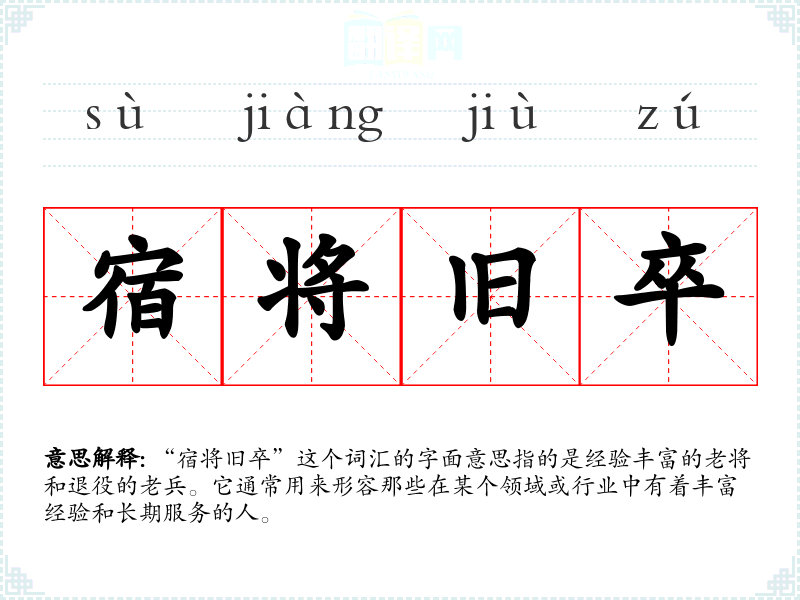 “宿将旧卒”这个词汇的字面意思指的是经验丰富的老将和退役的老兵。它通常用来形容那些在某个领域或行业中有着丰富经验和长期服务的人。