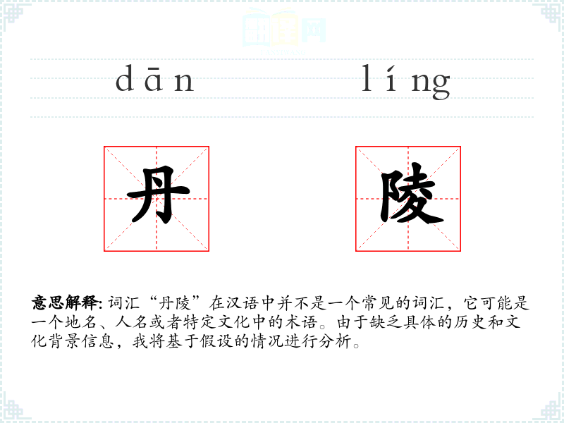 词汇“丹陵”在汉语中并不是一个常见的词汇,它可能是一个地名、人名或者特定文化中的术语。由于缺乏具体的历史和文化背景信息,我将基于假设的情况进行分析。