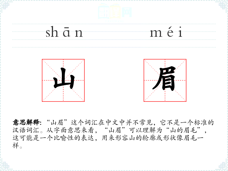 “山眉”这个词汇在中文中并不常见,它不是一个标准的汉语词汇。从字面意思来看,“山眉”可以理解为“山的眉毛”,这可能是一个比喻性的表达,用来形容山的轮廓或形状像眉毛一样。