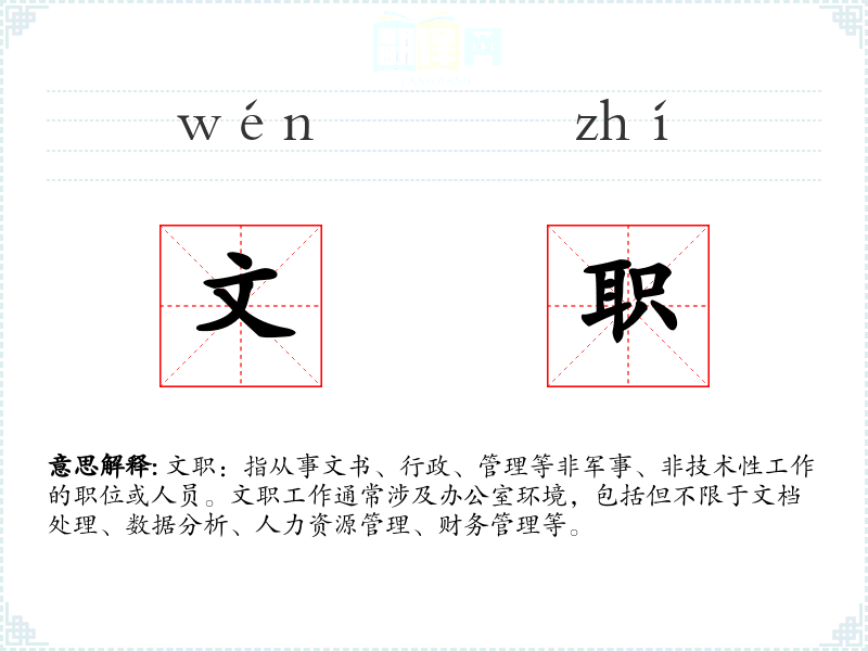 文职:指从事文书、行政、管理等非军事、非技术性工作的职位或人员。文职工作通常涉及办公室环境,包括但不限于文档处理、数据分析、人力资源管理、财务管理等。