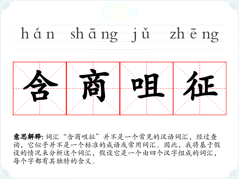 词汇“含商咀征”并不是一个常见的汉语词汇,经过查询,它似乎并不是一个标准的成语或常用词汇。因此,我将基于假设的情况来分析这个词汇,假设它是一个由四个汉字组成的词汇,每个字都有其独特的含义。