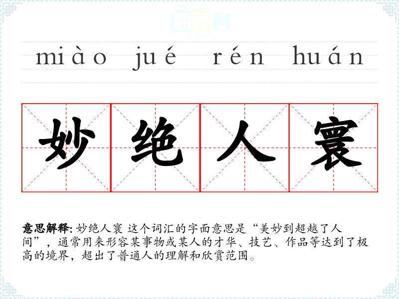 妙绝人寰 这个词汇的字面意思是“美妙到超越了人间”,通常用来形容某事物或某人的才华、技艺、作品等达到了极高的境界,超出了普通人的理解和欣赏范围。