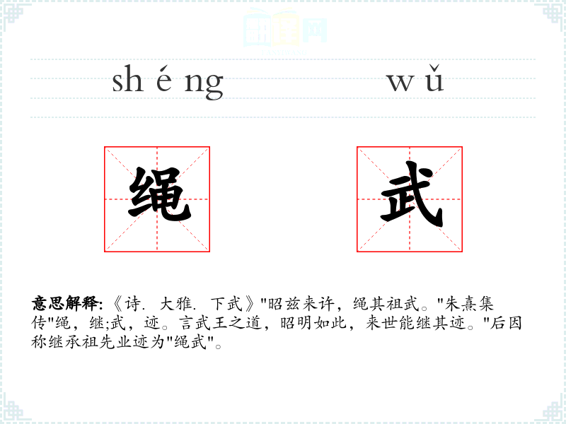 。"朱熹集传"绳,继;武,迹。言武王之道,昭明如此,来世能继其迹。"后因称继承祖先业迹为"绳武"。