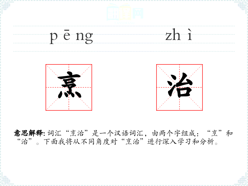 “烹”字在古代汉语中已有,源自烹饪的动作;“治”字最初指治理、管理,后来也用于指调理食物。两个字结合成“烹治”,强调了烹饪过程中的调理和精细化。