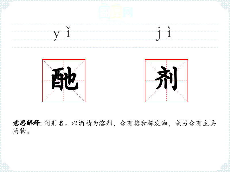 制剂名。以酒精为溶剂,含有糖和挥发油,或另含有主要药物。