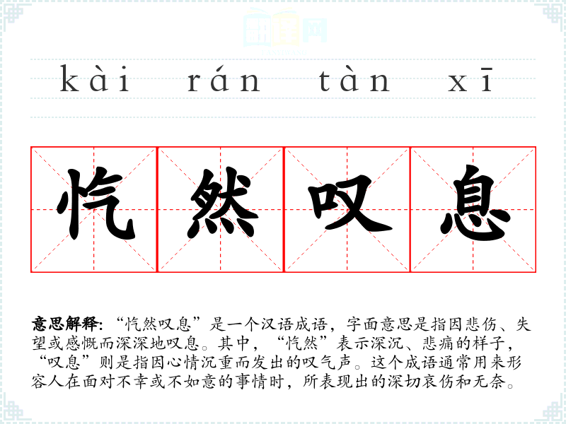 “忾然叹息”是一个汉语成语,字面意思是指因悲伤、失望或感慨而深深地叹息。其中,“忾然”表示深沉、悲痛的样子,“叹息”则是指因心情沉重而发出的叹气声。这个成语通常用来形容人在面对不幸或不如意的事情时,所表现出的深切哀伤和无奈。