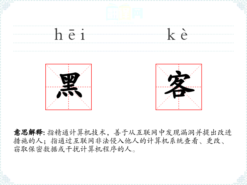 指精通计算机技术,善于从互联网中发现漏洞并提出改进措施的人;指通过互联网非法侵入他人的计算机系统查看、更改、窃取保密数据或干扰计算机程序的人。